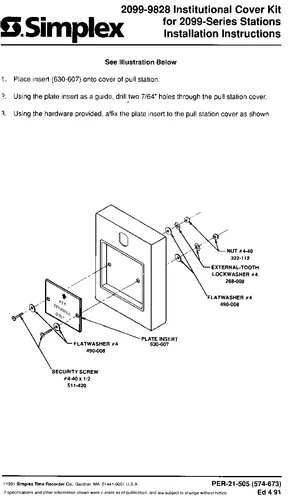 Installation Manual for the Simplex 2099-9828, published in 1991. Document No: PER-21-505 (574-673), Rev: Ed 4 91. Model 2099-9828. Physical installation guide, backbox dimensions, and cabling specifications.