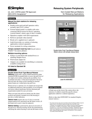 Datasheet for the Simplex 2099 Series Manual Release Stations, published in 2007. Document No: S2099-0010-2, Rev: 2. Models 2099-9149 and 2099-9152. Detailed technical specifications, electrical ratings, and agency listings.