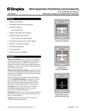 Datasheet for the Simplex 2099 Series Manual Stations, published in 2000. Document No: S12099-0007-1, Rev: 9/00. 18 models including 2099-9754C, 2099-9288C, 2099-9752C and 15 additional variants. Detailed technical specifications, electrical ratings, and agency listings.