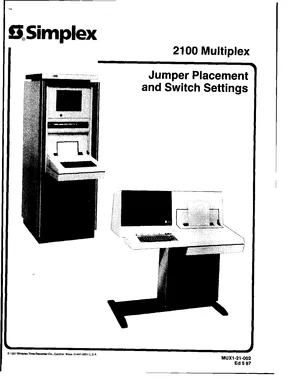 Manual for the Simplex 2100 Jumper Placement and Switch Settings, published in 1987. Document No: MUX1-21-002, Rev: Ed 5 87. Model 2100. Component descriptions, indicators and controls, and user interactions.
