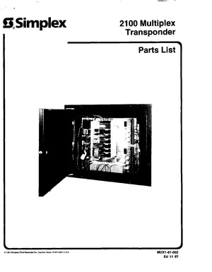 Manual for the Simplex 2100 Transponder Parts List, published in 1987. Document No: MUX1-81-002, Rev: Ed 11 87. Model 2100. Component descriptions, indicators and controls, and user interactions.
