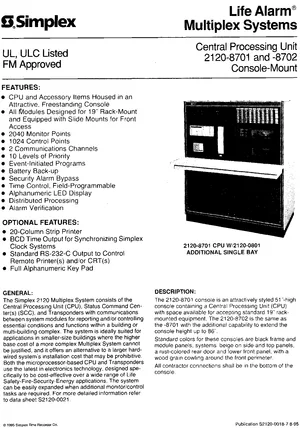 Datasheet for the Simplex 2120-8701 and 2120-8702, published in 1995. Document No: S2120-0018, Rev: 7. 85 models including 2120-8701, 2120-8702, 2120-8703 and 82 additional variants. Product features, environmental operating limits, and compatibility data.