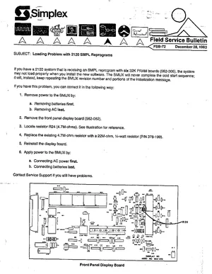 Troubleshooting Guide for the Simplex 2120 and 2098-9603 Field Service Bulletin, published in 1984. Document No: FSB-71 to FSB-75. 9 models including 2120, 2098-9603, 562-305 and 6 additional variants. Hardware installation, alarm/fault management, and advanced system configuration.