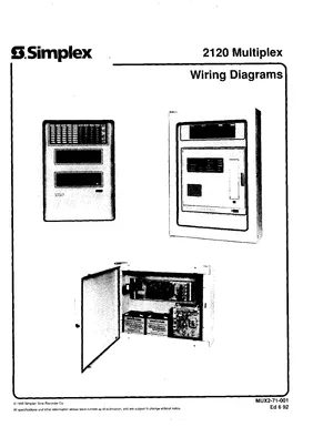 Wiring Diagram for the Simplex 2120 and 2100, published in 1992. Document No: MUX2-71-001, Rev: Ed 6 92. Models 2120 and 2100. Detailed interconnection diagrams, terminal layouts, and riser schematics.
