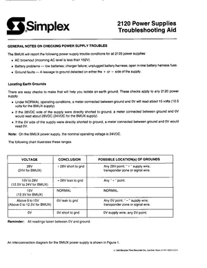 Manual for the Simplex 2120 Power Supplies Troubleshooting Aid, published in 1988. Document No: MUX2-61-006, Rev: Ed 6 88. 6 models including 2120, BMUX, BT and 3 additional variants. System overview, features and capabilities, and basic operation.