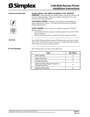 Installation and Programming Manual for the Simplex 2190-9039, published in 2000. Document No: 574-811, Rev: B. Models 2190-9039 and SP-700. Physical installation procedures and comprehensive software setup guide.