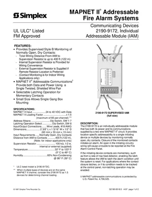 Datasheet for the Simplex 2190-9172, published in 1997. Document No: S2190-0018-3. Models 2190-9172 and 2190-9172C. Detailed technical specifications, electrical ratings, and agency listings.
