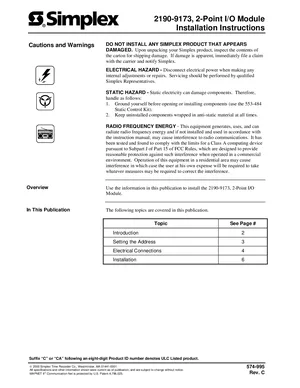 Installation Manual for the Simplex 2190-9173, published in 2000. Document No: 574-995, Rev: C. Models 2190-9173, 2190-9173C and 2190-9173CA. Physical installation guide, backbox dimensions, and cabling specifications.