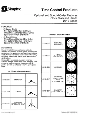 Datasheet for the Simplex 2310 Series Clock Dials and Hands, published in 1993. Document No: S2310-0005, Rev: 5. Model 2310. Product features, environmental operating limits, and compatibility data.