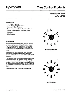 Datasheet for the Simplex 2312 Series Executive Clocks, published in 1995. Document No: S2312-0001-5, Rev: 5. 8 models including 2312-9001, 2312-9002, 2312-9003 and 5 additional variants. Detailed technical specifications, electrical ratings, and agency listings.