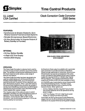 Datasheet for the Simplex 2320 Series Clock Code Converter, published in 1993. Document No: S2320-0001-4. 4 models including 2320-9001, 2320-9006, 2320-9007 and 1 additional variants. Product features, environmental operating limits, and compatibility data.
