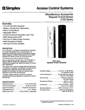 Datasheet for the Simplex 2750-Series Sensors, published in 1996. Document No: S2750-0003-1, Rev: 1. Models 2750-9813 and 2750-9814. Engineering specifications, wiring diagrams, and mounting dimensions.