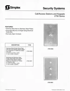 Datasheet for the Simplex 2750 Series Stations, published in 1993. Document No: S2750-0002, Rev: 3. Models 2750-9001 and 2750-9002. Detailed technical specifications, electrical ratings, and agency listings.