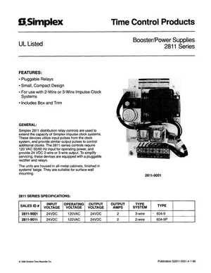 Datasheet for the Simplex 2811 Series Power Supply, published in 1996. Document No: S2811-0001, Rev: 4. Models 2811-9001 and 2811-9011. Product features, environmental operating limits, and compatibility data.