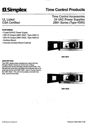 Datasheet for the Simplex 2861 Series Power Supplies, published in 1998. Document No: S2861-0002-3, Rev: 3. Models 2861-9021 and 2861-9022. Engineering specifications, wiring diagrams, and mounting dimensions.