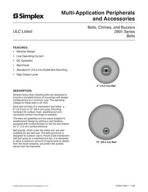 Datasheet for the Simplex 2901 Series Bells, published in 2000. Document No: S12901-0004-1, Rev: 11/00. Models 2901-9711, 2901-9712 and 2905-9305. Product features, environmental operating limits, and compatibility data.