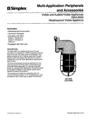 Datasheet for the Simplex 2904-9060 Weatherproof Visible Appliance, published in 1996. Document No: S2904-0001-5. Models 2904-9060 and Type-4360. Product features, environmental operating limits, and compatibility data.