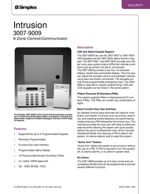 Datasheet for the Simplex 3007-9009 6-Zone Control, published in 1998. Document No: S3007-0003, Rev: 8/98. 7 models including 3007-9009, 3007-9010, 3007-9501 and 4 additional variants. Product features, environmental operating limits, and compatibility data.