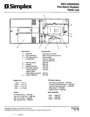 Manual for the Simplex 4001-9403 and 4001-9404 Parts List, published in 1988. Document No: FA4-81-002, Rev: Ed 1 88. Models 4001-9403, 4001-9404 and 4001. Capabilities, specifications summary, and usage notes.
