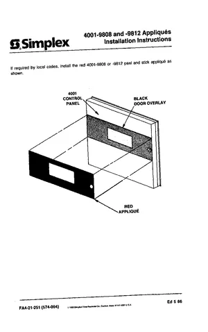 Installation Manual for the Simplex 4001-9808 and 4001-9812, published in 1986. Document No: FA4-21-251 (574-004), Rev: Ed 5 86. Models 4001-9808 and 4001-9812. Physical installation guide, backbox dimensions, and cabling specifications.
