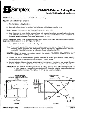 Installation Manual for the Simplex 4001-9809, published in 1986. Document No: FA4-21-252 (574-005), Rev: Ed 3 86. Model 4001-9809. Mounting instructions, wiring diagrams, and system power-up procedures.
