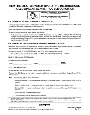 Operating Instructions for the Simplex 4002, published in 1994. Document No: FA4-31-150, Rev: Ed 12 94. Model 4002. Mounting and wiring instructions, user operating guides, and system software setup.