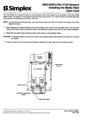 Installation Manual for the Simplex 4002, 4020, 4100+, 4120 Media Fiber Optic Card, published in 1994. Document No: FA4-21-409, Rev: Ed 11 94. 4 models including 4002, 4020, 4100+ and 1 additional variants. Mounting instructions, wiring diagrams, and system power-up procedures.