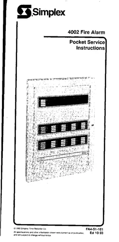 Manual for the Simplex 4002 Pocket Service Instructions, published in 1993. Document No: FA4-51-161, Rev: Ed 10 93. 12 models including 4002, 562-909, 565-180 and 9 additional variants. Capabilities, specifications summary, and usage notes.