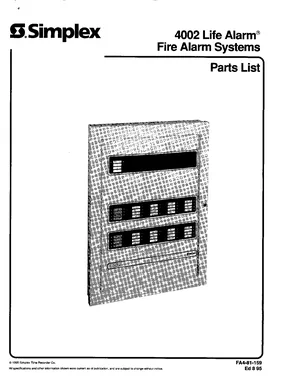 Manual for the Simplex 4002 Series Parts List, published in 1995. Document No: FA4-81-159, Rev: Ed 8 95. 49 models including 4002, 4002-7002, 4002-5001 and 46 additional variants. Capabilities, specifications summary, and usage notes.