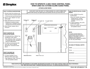 Operating Instructions for the Simplex 4003, published in 1993. Document No: FA4-31-501 (574-040), Rev: Ed 11 93. Model 4003. Hardware installation, alarm/fault management, and advanced system configuration.