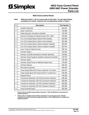 Manual for the Simplex 4003 and 4009 Parts List, published in 1999. Document No: 574-905, Rev: A. Models 4003 and 4009. Component descriptions, indicators and controls, and user interactions.