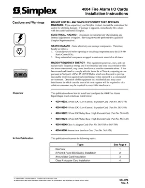 Installation Manual for the Simplex 4004 I/O Cards, published in 1998. Document No: 574-076, Rev: A. 7 models including 4004, 4004-9802, 4004-9804 and 4 additional variants. Mounting instructions, wiring diagrams, and system power-up procedures.