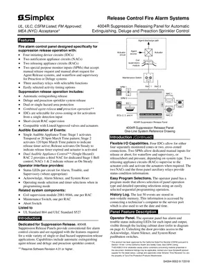 Datasheet for the Simplex 4004R, published in 2018. Document No: S4004-0002, Rev: 9. 24 models including 4004R, 4004-9301, 4004-9302 and 21 additional variants. Product features, environmental operating limits, and compatibility data.