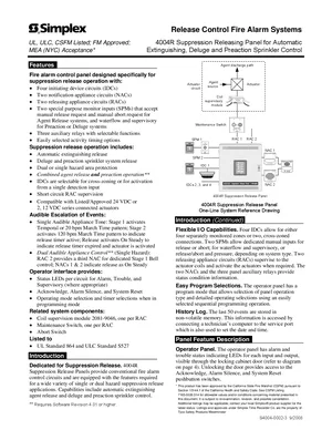 Datasheet for the Simplex 4004R, published in 2008. Document No: S4004-0002-3, Rev: 3. 49 models including 4004R, 4004-9301, 4004-9302 and 46 additional variants. Detailed technical specifications, electrical ratings, and agency listings.