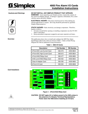 Installation Manual for the Simplex 4005 I/O Cards, published in 1998. Document No: 574-070, Rev: A. 6 models including 4005-9804, 4005-9824, 4005-9805 and 3 additional variants. Hardware installation, terminal connections, and environmental requirements.