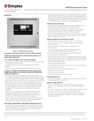 Datasheet for the Simplex 4007ES, published in 2019. Document No: S4007-0002, Rev: 17. 33 models including 4007ES, 4007-9201, 4007-9201BA and 30 additional variants. Detailed technical specifications, electrical ratings, and agency listings.