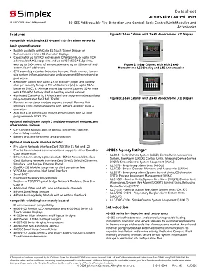 Datasheet for the Simplex 4010-9401 Series, published in 2025. Document No: S4010-0006, Rev: 25. 15 models including 4010-9401, 4010-9402, 4010-9404 and 12 additional variants. Detailed technical specifications, electrical ratings, and agency listings.