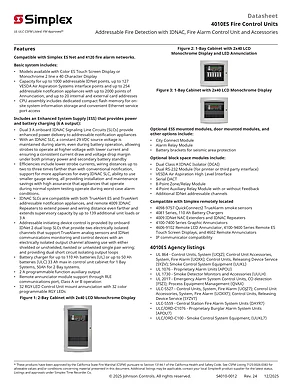 Datasheet for the Simplex 4010-9601 Series, published in 2025. Document No: S4010-0012, Rev: Rev. 24. 9 models including 4010-9601, 4010-9602, 4010-9701 and 6 additional variants. Product features, environmental operating limits, and compatibility data.