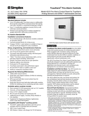 Datasheet for the Simplex 4010, published in 2004. Document No: S4010-0001, Rev: 9. 49 models including 4010, 4010-9101, 4010-9102 and 46 additional variants. Detailed technical specifications, electrical ratings, and agency listings.