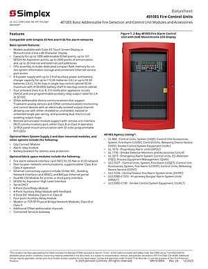 Datasheet for the Simplex 4010ES Fire Control Units, published in 2025. Document No: S4010-0004, Rev: Rev. 28. Model 4010ES. Engineering specifications, wiring diagrams, and mounting dimensions.