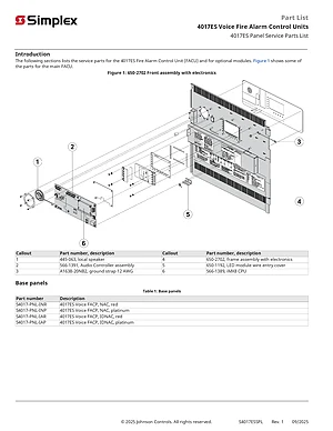 Manual for the Simplex 4017ES Panel Service Parts List, published in 2025. Document No: S4017ESSPL, Rev: 1. Model 4017ES. Capabilities, specifications summary, and usage notes.