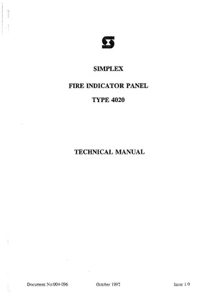 Technical Reference Manual for the Simplex 4020, published in 1992. Document No: 004-096, Rev: Issue 1.0. Model 4020. System architecture, detailed circuit analysis, and engineering specifications.