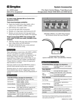 Datasheet for the Simplex 4098-9843 and 2088 Series Control Relays, published in 2006. Document No: S2088-0010, Rev: 8. 20 models including 4098-9843, 2088-9007, 2088-9008 and 17 additional variants. Detailed technical specifications, electrical ratings, and agency listings.