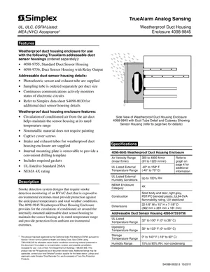 Datasheet for the Simplex 4098-9845, published in 2011. Document No: S4098-0032-3, Rev: 3. Models 4098-9845, 4098-9755 and 4098-9756. Engineering specifications, wiring diagrams, and mounting dimensions.