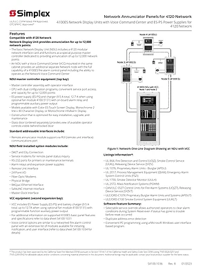 Datasheet for the Simplex 4100-9720 Series, published in 2023. Document No: S4100-1036, Rev: 8. 12 models including 4100-9720, 4100-9721, 4100-9722 and 9 additional variants. Product features, environmental operating limits, and compatibility data.