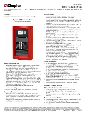 Datasheet for the Simplex 4100ES, published in 2025. Document No: S4100-1031, Rev: 19. 67 models including 4100ES, 4100-9701, 4100-9702 and 64 additional variants. Detailed technical specifications, electrical ratings, and agency listings.