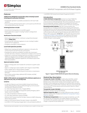 Datasheet for the Simplex 4100ES MINIPLEX Transponders, published in 2021. Document No: S4100-1035, Rev: 5. Models 4100-9600 and 4100-9601. Engineering specifications, wiring diagrams, and mounting dimensions.
