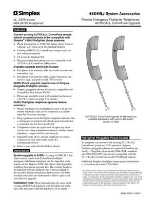 Datasheet for the Simplex 4100U Remote Firefighter Telephones, published in 2007. Document No: S2084-0002, Rev: 2. 8 models including 4100U, 2084-9030, 2084-9031 and 5 additional variants. Product features, environmental operating limits, and compatibility data.