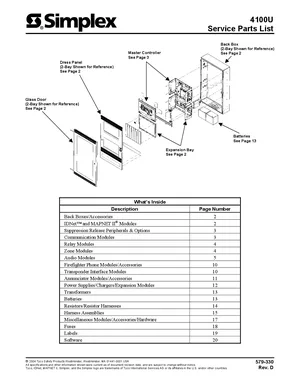 Manual for the Simplex 4100U Service Parts List, published in 2004. Document No: 579-330, Rev: D. 6 models including 4100U, 4100+, 4020 and 3 additional variants. Component descriptions, indicators and controls, and user interactions.