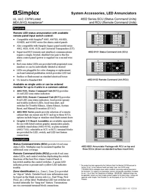 Datasheet for the Simplex 4602 Series LED Annunciators, published in 2018. Document No: S4602-0001-16. Models 4602-9101, 4602-9102 and 4602-8001. Product features, environmental operating limits, and compatibility data.